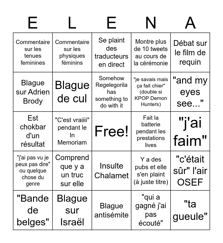 This bingo card has a free space and 24 words: "Bande de belges", Comprend que y a un truc sur elle, Somehow Regelegorila has something to do with it, "qui a gagné j'ai pas écouté", Débat sur le film de requin, Commentaire sur les tenues feminines, Commentaire sur les physiques féminins, Se plaint des traducteurs en direct, Fait la batterie pendant les prestations lives, "j'ai faim", Est chokbar d'un résultat, Blague de cul, Y a des pubs et elle s'en plaint (à juste titre), "c'était sûr" l'air OSEF, Blague sur Adrien Brody, Blague sur Israël, Blague antisémite, Montre plus de 10 tweets au cours de la cérémonie, "and my eyes see...", "j'ai pas vu je peux pas dire" ou quelque chose du genre, "C'est vraiiii" pendant le In Memoriam, Insulte Chalamet, "je savais mais ça fait chier" (double si KPOP Demon Hunters) and "ta gueule".