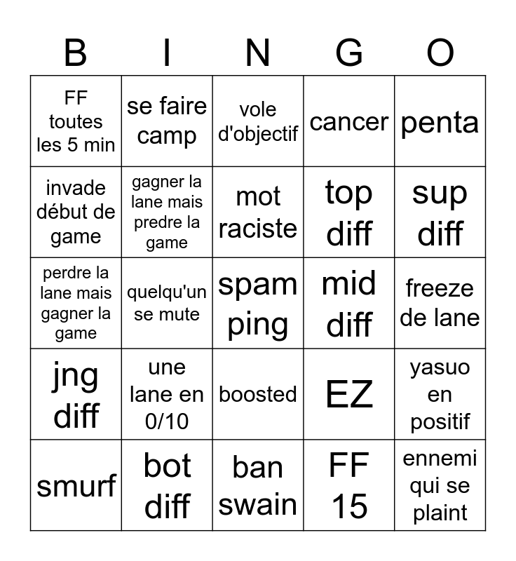 This bingo card has a free space and 24 words: une lane en 0/10, bot diff, mot raciste, smurf, penta, FF toutes les 5 min, invade début de game, se faire camp, mid diff, boosted, top diff, perdre la lane mais gagner la game, EZ, yasuo en positif, gagner la lane mais predre la game, FF 15, freeze de lane, vole d'objectif, sup diff, quelqu'un se mute, ennemi qui se plaint, jng diff, cancer and ban swain.
