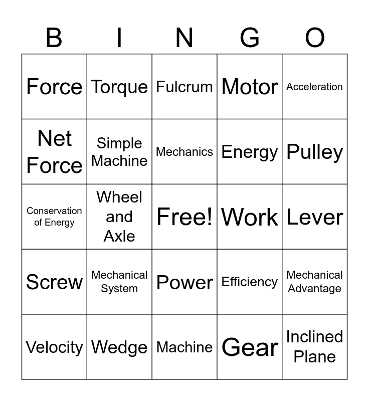 This bingo card has a free space and 25 words: Mechanical System, Machine, Mechanics, Velocity, Acceleration, Force, Net Force, Torque, Work, Power, Energy, Conservation of Energy, Efficiency, Mechanical Advantage, Simple Machine, Compound Machine, Lever, Fulcrum, Pulley, Wheel and Axle, Inclined Plane, Wedge, Screw, Motor and Gear.