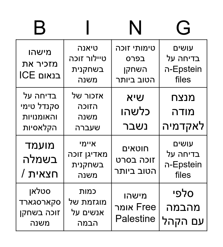 ⚠ This card has duplicate items: מישהו אומר Free Palestine (2), עושים בדיחה על ה-Epstein files (2), מועמד לאוסקר לא מגיע לטקס (2), מישהו מזכיר את אלוהים בנאום (2)