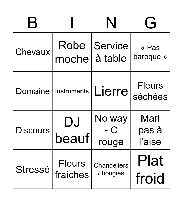 This bingo card has 16 words: Fleurs fraîches, Mari pas à l’aise, Service à table, Chevaux, Discours, Robe moche, No way - C rouge, Chandeliers / bougies, Domaine, Instruments, Stressé, « Pas baroque », DJ beauf, Fleurs séchées, Lierre and Plat froid.