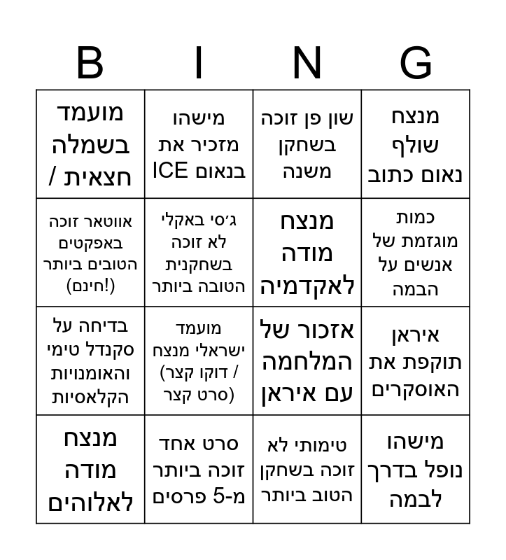 This bingo card has 16 words: סרט אחד זוכה ביותר מ-5 פרסים, איראן תוקפת את האוסקרים, שון פן זוכה בשחקן משנה, מועמד בשמלה / חצאית, בדיחה על סקנדל טימי והאומנויות הקלאסיות, מישהו מזכיר את ICE בנאום, אזכור של המלחמה עם איראן, טימותי לא זוכה בשחקן הטוב ביותר, אווטאר זוכה באפקטים הטובים ביותר (חינם!), ג׳סי באקלי לא זוכה בשחקנית הטובה ביותר, מנצח מודה לאלוהים, מנצח שולף נאום כתוב, מועמד ישראלי מנצח (דוקו קצר / סרט קצר), כמות מוגזמת של אנשים על הבמה, מנצח מודה לאקדמיה and מישהו נופל בדרך לבמה.