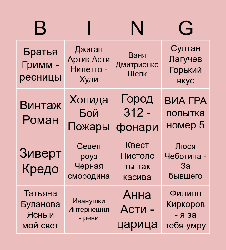 This bingo card has 30 words: А-студио - улетаю, Андрей Губин - такие девушки, Анна Асти - царица, Битуев Нэнси Сидоров - как быть, Братья Гримм - ресницы, Джиган Артик Асти Нилетто - Худи, Город 312 - фонари, Филипп Киркоров - я за тебя умру, Ирина Алегрова - императрица, Иванушки Интернешнл - реви, Джаздюрен - дарите женщинам цветы, Люся Чеботина - За бывшего, Максим - знаешь ли ты, Николай Басков Все цветы, Квест Пистолс ты так касива, Саби Мия Бойко Базовый минимум, Сергей Лазарев в самое сердце, Севен роуз Черная смородина, Стас Михайлов Все для тебя, Султан Лагучев Горький вкус, Татьяна Буланова Ясный мой свет, Татьяна Куртункова Одного, Ваня Дмитриенко Шелк, ВИА ГРА попытка номер 5, Винтаж Роман, Холида Бой Пожары, Юлия Савичева Если в сердце живет любовь, Жанна Фриске А на море белый песок, Зиверт Кредо and Шуфутинский марджанджа.