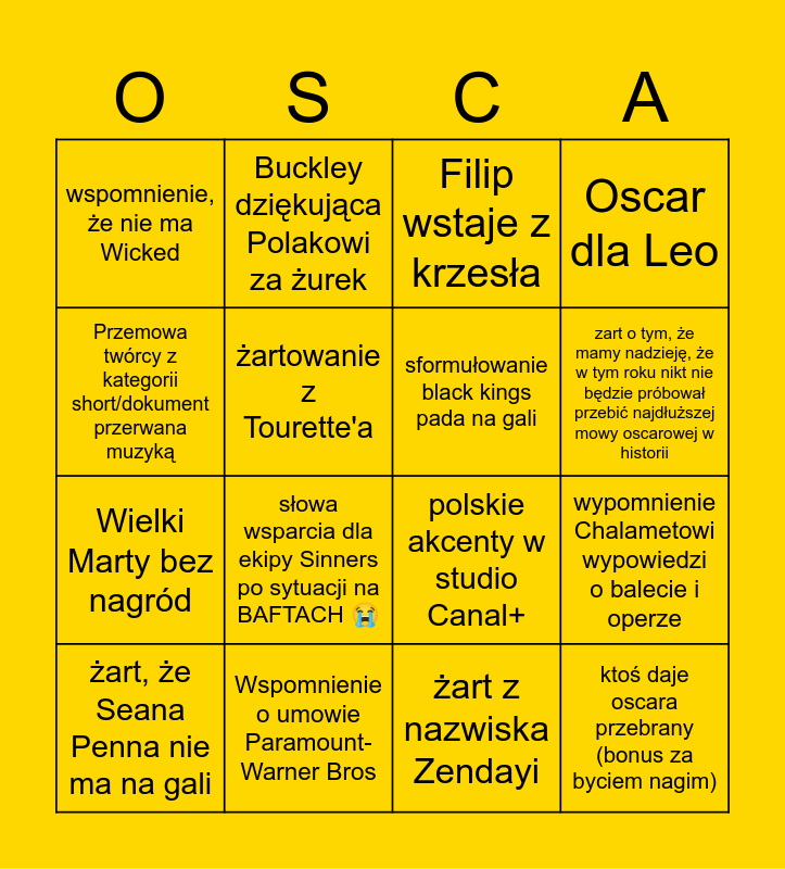 This bingo card has 16 words: Wspomnienie o umowie Paramount-Warner Bros, wypomnienie Chalametowi wypowiedzi o balecie i operze, Filip wstaje z krzesła, wspomnienie, że nie ma Wicked, Wielki Marty bez nagród, Buckley dziękująca Polakowi za żurek, polskie akcenty w studio Canal+, żart z nazwiska Zendayi, Przemowa twórcy z kategorii short/dokument przerwana muzyką, żartowanie z Tourette'a, żart, że Seana Penna nie ma na gali, Oscar dla Leo, słowa wsparcia dla ekipy Sinners po sytuacji na BAFTACH 😭, zart o tym, że mamy nadzieję, że w tym roku nikt nie będzie próbował przebić najdłuższej mowy oscarowej w historii, sformułowanie black kings pada na gali and ktoś daje oscara przebrany (bonus za byciem nagim).
