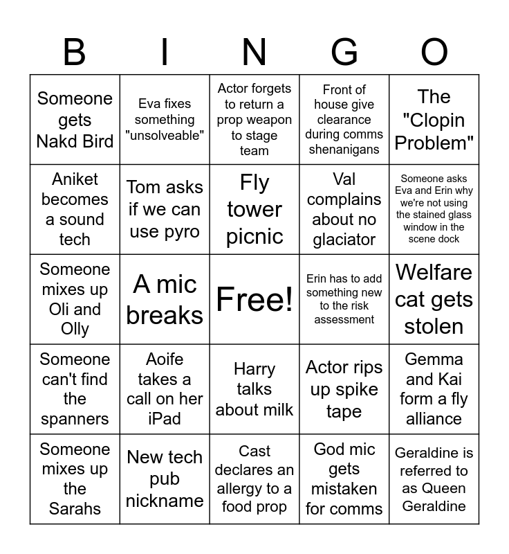 This bingo card has a free space and 26 words: Harry talks about milk, God mic gets mistaken for comms, Fly tower picnic, New tech pub nickname, The "Clopin Problem", Someone gets Nakd Bird, Aniket becomes a sound tech, Eva fixes something "unsolveable", Welfare cat gets stolen, Actor rips up spike tape, Val complains about no glaciator, Someone mixes up Oli and Olly, Gemma and Kai form a fly alliance, Someone mixes up the Sarahs, A mic breaks, Actors in the scene dock can be heard from backstage, Front of house give clearance during comms shenanigans, Someone can't find the spanners, Actor forgets to return a prop weapon to stage team, Geraldine is referred to as Queen Geraldine, Someone asks Eva and Erin why we're not using the stained glass window in the scene dock, Cast declares an allergy to a food prop, Erin has to add something new to the risk assessment, Aoife takes a call on her iPad, Tom asks if we can use pyro and Water bottle falls over backstage.