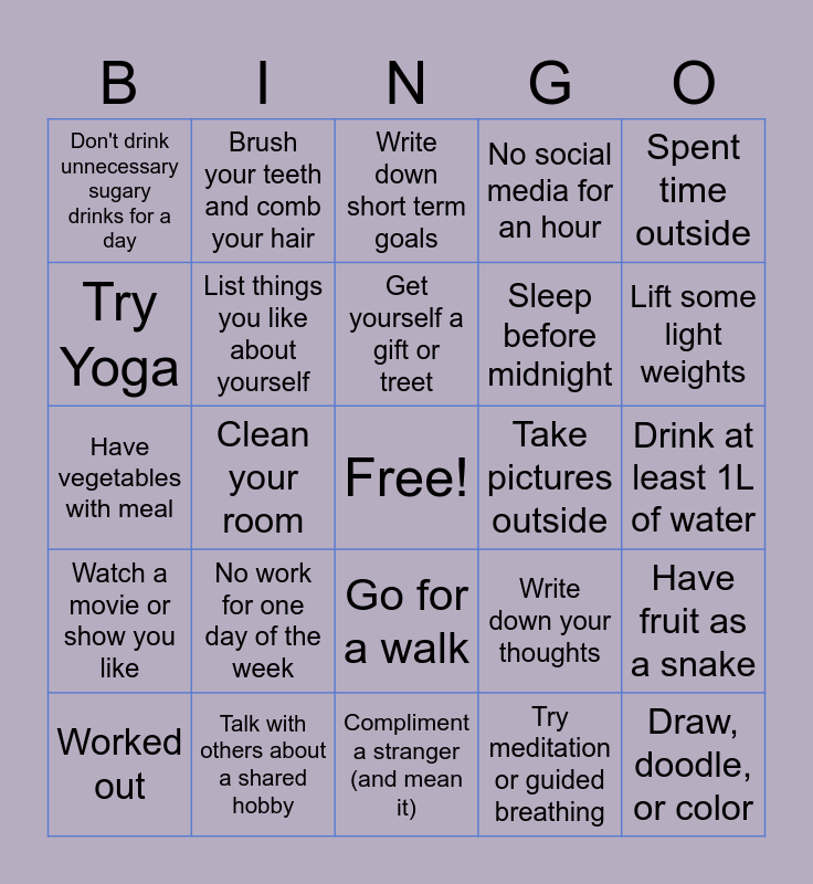 This bingo card has a free space and 24 words: No work for one day of the week, Talk with others about a shared hobby, Get yourself a gift or treet, Worked out, Spent time outside, Don't drink unnecessary sugary drinks for a day, Try Yoga, Brush your teeth and comb your hair, Take pictures outside, Go for a walk, Sleep before midnight, Have vegetables with meal, Write down your thoughts, Have fruit as a snake, List things you like about yourself, Try meditation or guided breathing, Drink at least 1L of water, Write down short term goals, Lift some light weights, Clean your room, Draw, doodle, or color, Watch a movie or show you like, No social media for an hour and Compliment a stranger (and mean it).