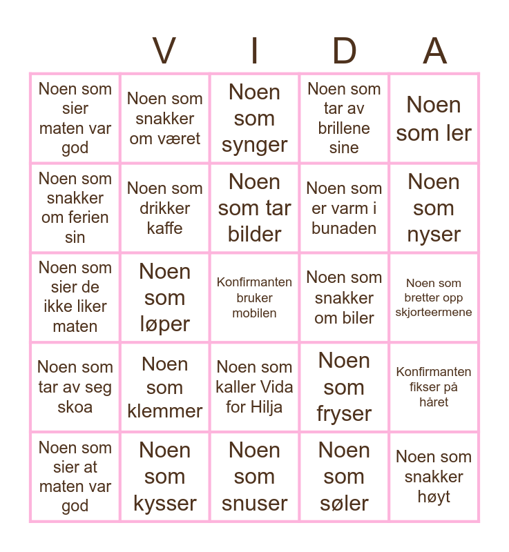 This bingo card has 40 words: Noen som himler med øynene, Noen som løper, Noen som danser, Noen som fryser, Noen som snakker høyt, Noen som sier de ikke liker maten, Noen som drikker kaffe, Noen som sier "Tnåååå", Noen som er varm i bunaden, Konfirmanten fikser på håret, Noen som sier maten var god, Noen som snakker om været, Konfirmanten bruker mobilen, Noen som søler, Noen som bretter opp skjorteermene, Noen som snakker om ferien sin, Noen som sier "javel", Noen som synger, Noen som har glemt noe, Noen som ler, Noen som tar av seg skoa, Noen som kysser, Noen som tar bilder, Noen som snakker om biler, Noen som må på do, Noen som spiser taco, Noen som drikker kaffe, Noen som banner, Noen som rydder, Noen som bruker mobilen, Noen som sier at tiden går altfor fort, Noen som klemmer, Noen som kaller Vida for Hilja, Noen som er mette, Noen som nyser, Noen som sier at maten var god, Noen som gjesper, Noen som snuser, Noen som tar av brillene sine and Noen som spiller på mobilen.