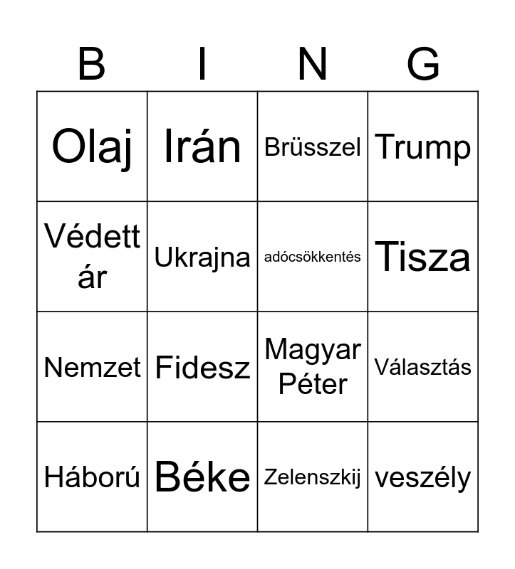 This bingo card has 17 words: Háború, Béke, Brüsszel, Trump, Nemzet, Ukrajna, Magyar Péter, Tisza, Védett ár, Fidesz, Zelenszkij, Választás, Olaj, Irán, adócsökkentés, veszély and veszély.