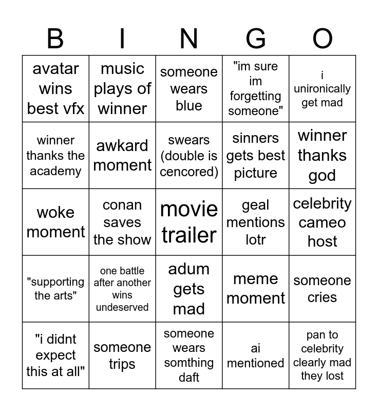 This bingo card has a free space and 24 words: one battle after another wins undeserved, someone trips, swears (double is cencored), "i didnt expect this at all", i unironically get mad, avatar wins best vfx, winner thanks the academy, music plays of winner, geal mentions lotr, adum gets mad, sinners gets best picture, woke moment, meme moment, someone cries, awkard moment, ai mentioned, celebrity cameo host, someone wears blue, winner thanks god, conan saves the show, pan to celebrity clearly mad they lost, "supporting the arts", "im sure im forgetting someone" and someone wears somthing daft.