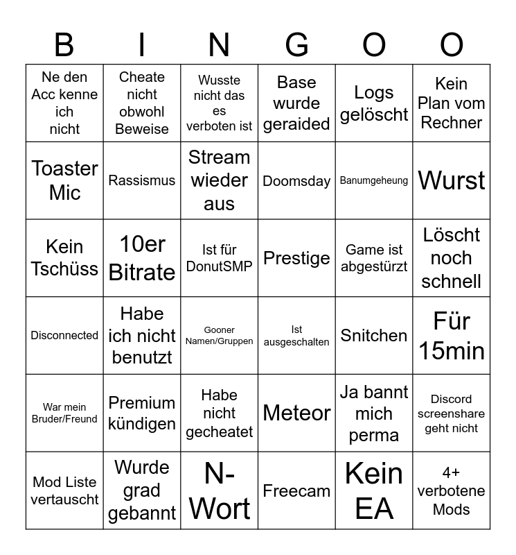 This bingo card has 36 words: Meteor, Habe nicht gecheatet, Freecam, Toaster Mic, Disconnected, Prestige, Rassismus, N-Wort, Logs gelöscht, Ja bannt mich perma, Wurst, Base wurde geraided, Discord screenshare geht nicht, 10er Bitrate, Doomsday, Ne den Acc kenne ich nicht, War mein Bruder/Freund, Game ist abgestürzt, Kein Tschüss, Wusste nicht das es verboten ist, Ist für DonutSMP, Habe ich nicht benutzt, Ist ausgeschalten, Gooner Namen/Gruppen, Snitchen, Cheate nicht obwohl Beweise, Banumgeheung, Wurde grad gebannt, Stream wieder aus, Kein Plan vom Rechner, 4+ verbotene Mods, Mod Liste vertauscht, Für 15min, Löscht noch schnell, Premium kündigen and Kein EA.