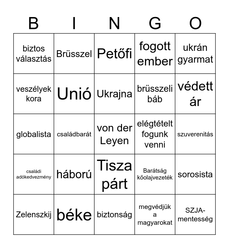 This bingo card has a free space and 24 words: háború, béke, Ukrajna, Zelenszkij, ukrán gyarmat, biztos választás, veszélyek kora, Brüsszel, elégtételt fogunk venni, Tisza párt, brüsszeli báb, globalista, Barátság kőolajvezeték, sorosista, Unió, megvédjük a magyarokat, szuverenitás, Petőfi, védett ár, családbarát, SZJA-mentesség, családi adókedvezmény, fogott ember and biztonság.