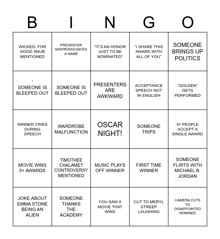 This bingo card has a free space and 24 words: TIMOTHÉE CHALAMET CONTROVERSY MENTIONED, SOMEONE THANKS THE ACADEMY, PRESENTERS ARE AWKWARD, JOKE ABOUT EMMA STONE BEING AN ALIEN, SOMEONE BRINGS UP POLITICS, WICKED: FOR GOOD SNUB MENTIONED, ' SOMEONE IS BLEEPED OUT, PRESENTER MISPRONOUNCES A NAME, SOMEONE TRIPS, MUSIC PLAYS OFF WINNER, ACCEPTANCE SPEECH NOT IN ENGLISH, WINNER CRIES DURING SPEECH, FIRST TIME WINNER, SOMEONE FLIRTS WITH MICHAEL B. JORDAN, SOMEONE IS BLEEPED OUT, CUT TO MERYL STREEP LAUGHING, 5+ PEOPLE ACCEPT A SINGLE AWARD, “IT’S AN HONOR JUST TO BE NOMINATED”, “GOLDEN” GETS PERFORMED, WARDROBE MALFUNCTION, CAMERA CUTS TO DISAPPOINTED NOMINEE, MOVIE WINS 5+ AWARDS, “I SHARE THIS AWARD WITH ALL OF YOU” and YOU SAW A MOVIE THAT WINS.