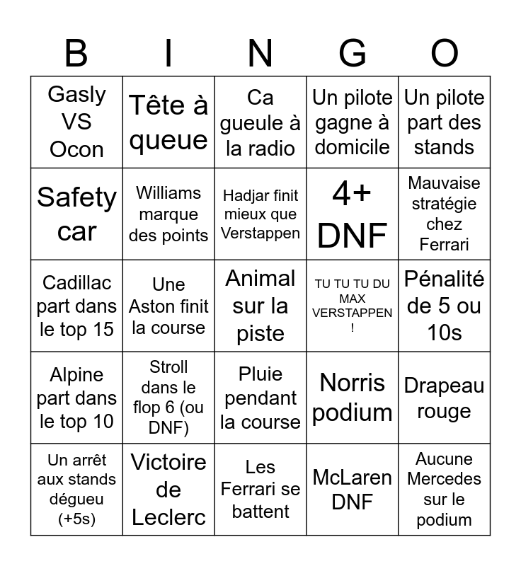 This bingo card has 25 words: Stroll dans le flop 6 (ou DNF), Les Ferrari se battent, Hadjar finit mieux que Verstappen, Un arrêt aux stands dégueu (+5s), Un pilote part des stands, Gasly VS Ocon, Safety car, Tête à queue, TU TU TU DU MAX VERSTAPPEN !, Pluie pendant la course, 4+ DNF, Cadillac part dans le top 15, Norris podium, Drapeau rouge, Williams marque des points, Aucune Mercedes sur le podium, Pénalité de 5 ou 10s, Ca gueule à la radio, Mauvaise stratégie chez Ferrari, Une Aston finit la course, Animal sur la piste, Victoire de Leclerc, Alpine part dans le top 10, Un pilote gagne à domicile and McLaren DNF.