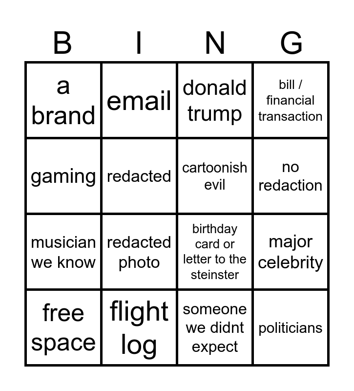 This bingo card has 16 words: flight log, major celebrity, donald trump, a brand, musician we know, email, birthday card or letter to the steinster, someone we didnt expect, gaming, redacted, free space, bill / financial transaction, redacted photo, no redaction, cartoonish evil and politicians.