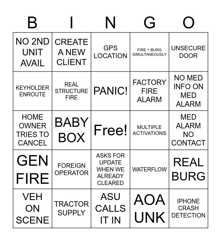 This bingo card has a free space and 24 words: FOREIGN OPERATOR, TRACTOR SUPPLY, PANIC!, VEH ON SCENE, UNSECURE DOOR, NO 2ND UNIT AVAIL, KEYHOLDER ENROUTE, CREATE A NEW CLIENT, MULTIPLE ACTIVATIONS, ASKS FOR UPDATE WHEN WE ALREADY CLEARED, FACTORY FIRE ALARM, HOME OWNER TRIES TO CANCEL, WATERFLOW, REAL BURG, REAL STRUCTURE FIRE, AOA UNK, MED ALARM NO CONTACT, GPS LOCATION, NO MED INFO ON MED ALARM, BABY BOX, IPHONE CRASH DETECTION, GEN FIRE, FIRE + BURG SIMULTANEOUSLY and ASU CALLS IT IN.