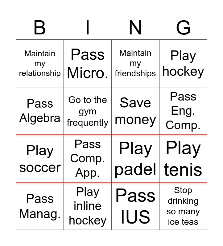 This bingo card has 16 words: Play inline hockey, Play tenis, Maintain my friendships, Maintain my relationship, Play soccer, Pass Micro., Play padel, Pass IUS, Pass Algebra, Go to the gym frequently, Pass Manag., Play hockey, Pass Comp. App., Pass Eng. Comp., Save money and Stop drinking so many ice teas.
