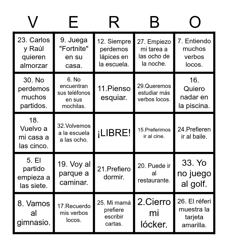 This bingo card has a free space and 34 words: 1.Almorzamos a las doce., 2.Cierro mi lócker., 3. Ella cuenta la verdad., 4. Duermo mucho los fines de semana., 5. El partido empieza a las siete., 6. No encuentran sus teléfonos en sus mochilas., 7. Entiendo muchos verbos locos., 8. Vamos al gimnasio., 9. Juega "Fortnite" en su casa., 10.Muestra videos locos., 11.Pienso esquiar., 12. Siempre perdemos lápices en la escuela., 13.Queremos escribir más verbos locos., 14. Puedo andar en patineta., 15.Preferimos ir al cine., 16. Quiero nadar en la piscina., 17.Recuerdo mis verbos locos., 18. Vuelvo a mi casa a las cinco., 19. Voy al parque a caminar., 20. Puede ir al restaurante., 21.Prefiero dormir., 22.Pensamos jugar al baloncesto., 23. Carlos y Raúl quieren almorzar, 24.Prefieren ir al baile., 25. Mi mamá prefiere escribir cartas., 26. El réferi muestra la tarjeta amarilla., 27. Empiezo mi tarea a las ocho de la noche., 28.Recordamos mucho vocabulario., 29.Queremos estudiar más verbos locos., 30. No perdemos muchos partidos., 31.Piensan jugar vóleibol., 32.Volvemos a la escuela a las ocho., 33. Yo no juego al golf. and 34.Entendemos muchas frases con verbos locos..