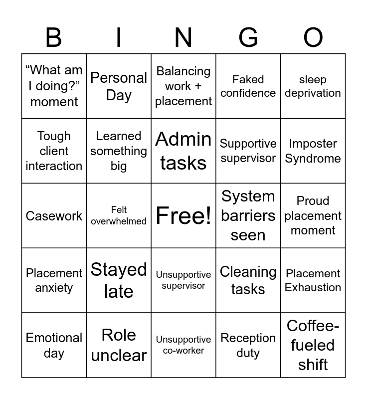 This bingo card has a free space and 24 words: Stayed late, Role unclear, Admin tasks, Emotional day, sleep deprivation, “What am I doing?” moment, Tough client interaction, Personal Day, System barriers seen, Unsupportive supervisor, Supportive supervisor, Casework, Cleaning tasks, Placement Exhaustion, Learned something big, Reception duty, Proud placement moment, Balancing work + placement, Imposter Syndrome, Felt overwhelmed, Coffee-fueled shift, Placement anxiety, Faked confidence and Unsupportive co-worker.