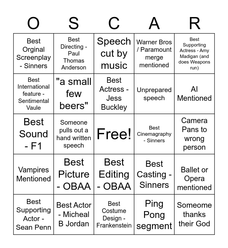 This bingo card has a free space and 24 words: Best Picture - OBAA, Best Actor - Micheal B Jordan, Best Actress - Jess Buckley, Best Supporting Actor - Sean Penn, Best Supporting Actress - Amy Madigan (and does Weapons run), Best Orginal Screenplay - Sinners, Best International feature - Sentimental Vaule, Best Directing - Paul Thomas Anderson, Best Cinemagraphy - Sinners, Best Editing - OBAA, Unprepared speech, Best Sound - F1, Best Casting - Sinners, Ballet or Opera mentioned, "a small few beers", Ping Pong segment, Camera Pans to wrong person, Speech cut by music, AI Mentioned, Someone pulls out a hand written speech, Someome thanks their God, Vampires Mentioned, Warner Bros / Paramount merge mentioned and Best Costume Design - Frankenstein.