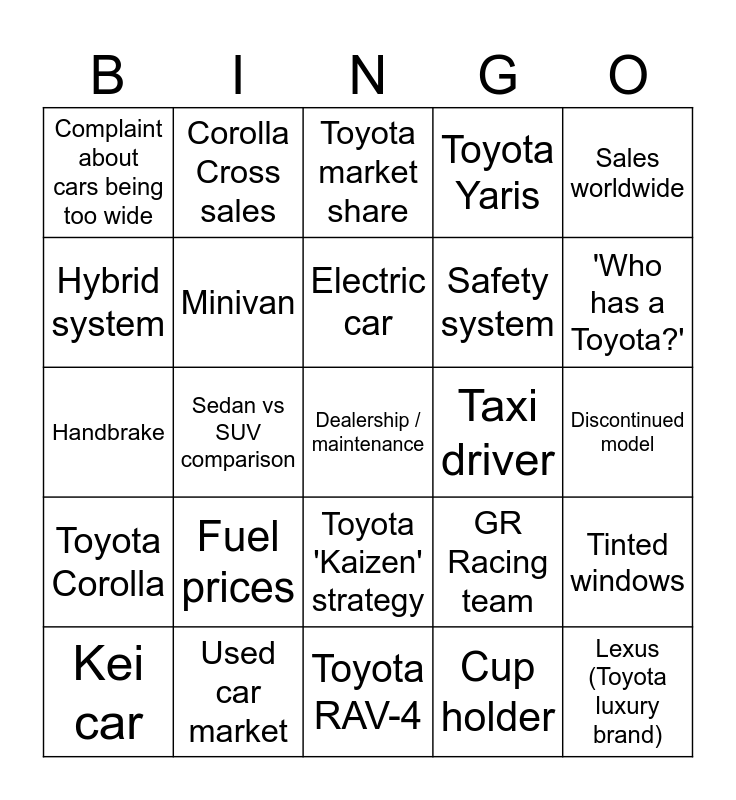 This bingo card has 25 words: Fuel prices, Toyota RAV-4, Electric car, Kei car, Sales worldwide, Complaint about cars being too wide, Hybrid system, Corolla Cross sales, Taxi driver, Toyota 'Kaizen' strategy, Safety system, Handbrake, GR Racing team, Tinted windows, Minivan, Lexus (Toyota luxury brand), Discontinued model, Toyota market share, 'Who has a Toyota?', Sedan vs SUV comparison, Dealership / maintenance, Used car market, Toyota Corolla, Toyota Yaris and Cup holder.