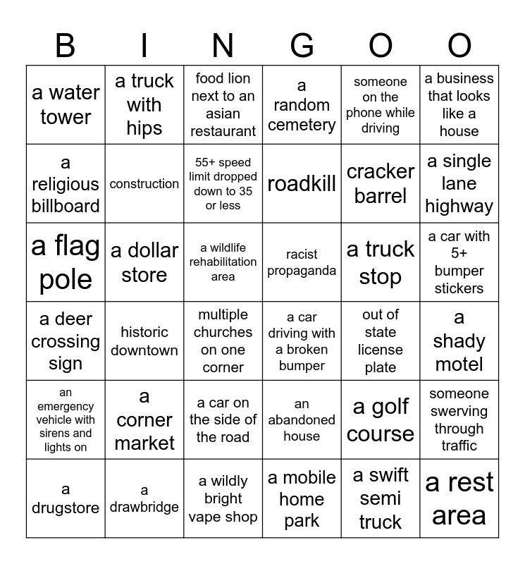 This bingo card has 36 words: an abandoned house, a car on the side of the road, a mobile home park, a religious billboard, a deer crossing sign, racist propaganda, construction, a wildly bright vape shop, someone on the phone while driving, a golf course, a single lane highway, a random cemetery, someone swerving through traffic, a dollar store, roadkill, a water tower, an emergency vehicle with sirens and lights on, a truck stop, a flag pole, food lion next to an asian restaurant, a wildlife rehabilitation area, historic downtown, a car driving with a broken bumper, multiple churches on one corner, out of state license plate, a truck with hips, cracker barrel, a drawbridge, 55+ speed limit dropped down to 35 or less, a business that looks like a house, a rest area, a drugstore, a shady motel, a car with 5+ bumper stickers, a corner market and a swift semi truck.
