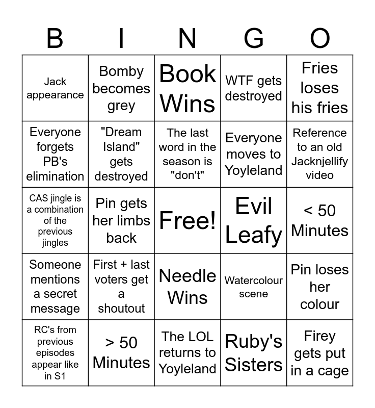 This bingo card has a free space and 24 words: First + last voters get a shoutout, > 50 Minutes, The last word in the season is "don't", RC's from previous episodes appear like in S1, Fries loses his fries, Jack appearance, Everyone forgets PB's elimination, Bomby becomes grey, Evil Leafy, Needle Wins, Everyone moves to Yoyleland, CAS jingle is a combination of the previous jingles, Watercolour scene, Pin loses her colour, "Dream Island" gets destroyed, Ruby's Sisters, < 50 Minutes, Book Wins, Reference to an old Jacknjellify video, Pin gets her limbs back, Firey gets put in a cage, Someone mentions a secret message, WTF gets destroyed and The LOL returns to Yoyleland.