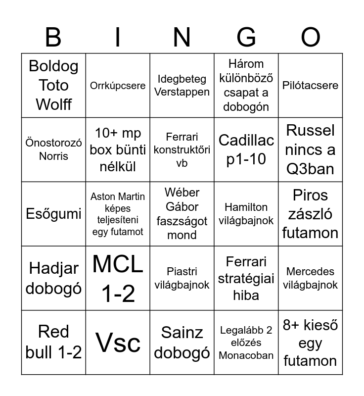 This bingo card has a free space and 24 words: MCL 1-2, Vsc, Ferrari konstruktőri vb, Red bull 1-2, Pilótacsere, Boldog Toto Wolff, Önostorozó Norris, Orrkúpcsere, Hamilton világbajnok, Piastri világbajnok, Cadillac p1-10, Esőgumi, Ferrari stratégiai hiba, Mercedes világbajnok, 10+ mp box bünti nélkül, Legalább 2 előzés Monacoban, Piros zászló futamon, Idegbeteg Verstappen, Russel nincs a Q3ban, Aston Martin képes teljesíteni egy futamot, 8+ kieső egy futamon, Hadjar dobogó, Három különböző csapat a dobogón and Sainz dobogó.