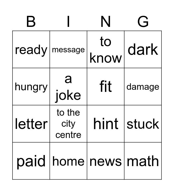 This bingo card has 16 words: home, stuck, to know, ready, letter, message, hint, news, hungry, a joke, paid, dark, to the city centre, damage, fit and math.