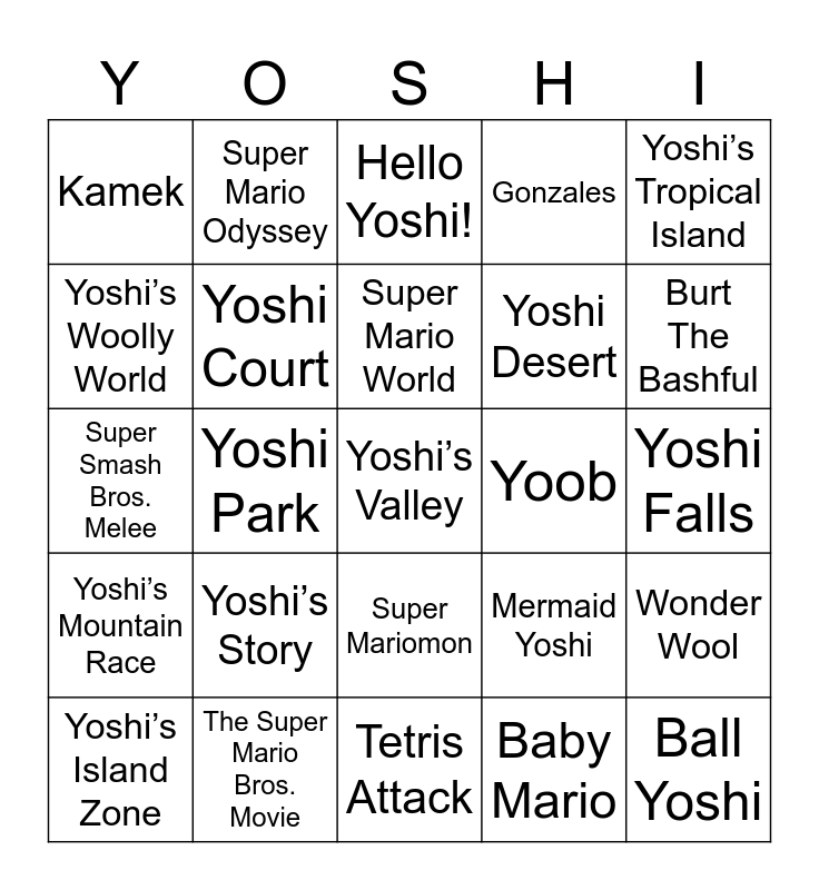 This bingo card has 76 words: Super Mario World 2: Yoshi’s Island, EEEEAAAAOOOO, Hello Yoshi!, Yoshi, Yoshi Egg, Yoshi’s Cookie, Mole Tank, Super Dragon, Raphael the Raven, Blimp Yoshi, Ball Yoshi, Yoshi Star Galaxy, Super Mario World, Yoshi’s Woolly World, Bobsled Yoshi, Yoshi Park, Super Smash Bros, Yoshi’s Valley, Poochy, Yoshi’s Tropical Island, Super Mario 64, Super Smash Bros. Melee, Yoshi Court, Super Mario Odyssey, Gonzales, Tyrannosaur Yoshisaur Munchikoopas, Yoshi Bike, Yoshi Island (MK8 Deluxe), Yoshi’s Adventure, Boshi, Waluigi Yoshi, Birdo, Bowser, Mermaid Yoshi, Burt The Bashful, Yoshi Desert, Lego Yoshi, Shy Guy, Yoshi Falls, Baby Mario, Super Mario Sunshine, The Stork, Pac-Man Yoshi, Yoshi Circuit, Yoshi’s Crafted World, Kamek’s Toadies, Yoshi’s Island Zone, Kamek, aMSa, Tap Tap the Red Nose, Blarg, Super Mariomon, Super Smash Bros. 3ds/Wii U, Mario is Missing!, Ukiki, Yoshi and the Mysterious Book, Animal Crossing: New Leaf, Pak E. Derm, Inkling Squid Yoshi, Helicopter Yoshi, Yoshi’s Story, Yoshi’s Safari, Big Yarn Ball, Link, Mario and Sonic at the Olympic Games Rio 2016, Hot Lips, Yoob, Mario Sport Mix, Kazumi Totaka, Crazee Dayzee, Wonder Wool, Yoshi’s Mountain Race, The Super Mario Bros. Movie, Mega Lantern Ghost, Tetris Attack and Li’l Smooch Spider.