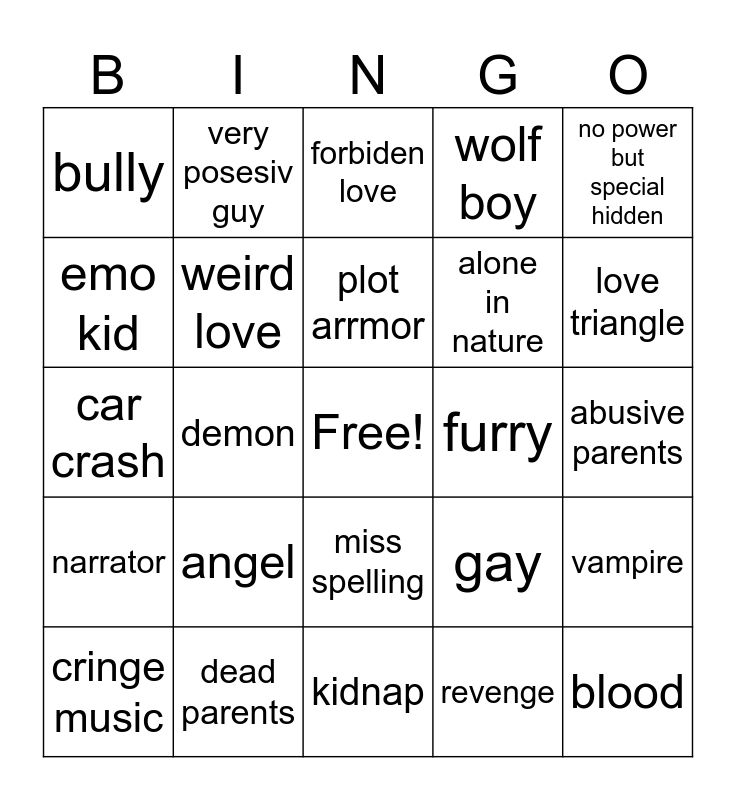 This bingo card has a free space and 29 words: cringe music, princess, demon, good side vs bad side, bully, forbiden love, weird love, angel, furry, dead parents, abusive parents, blood, kidnap, revenge, love triangle, bad designs, miss spelling, narrator, no power but special hidden, car crash, gay, golden child, alone in nature, emo kid, wolf boy, very posesiv guy, vampire, plot arrmor and random song.
