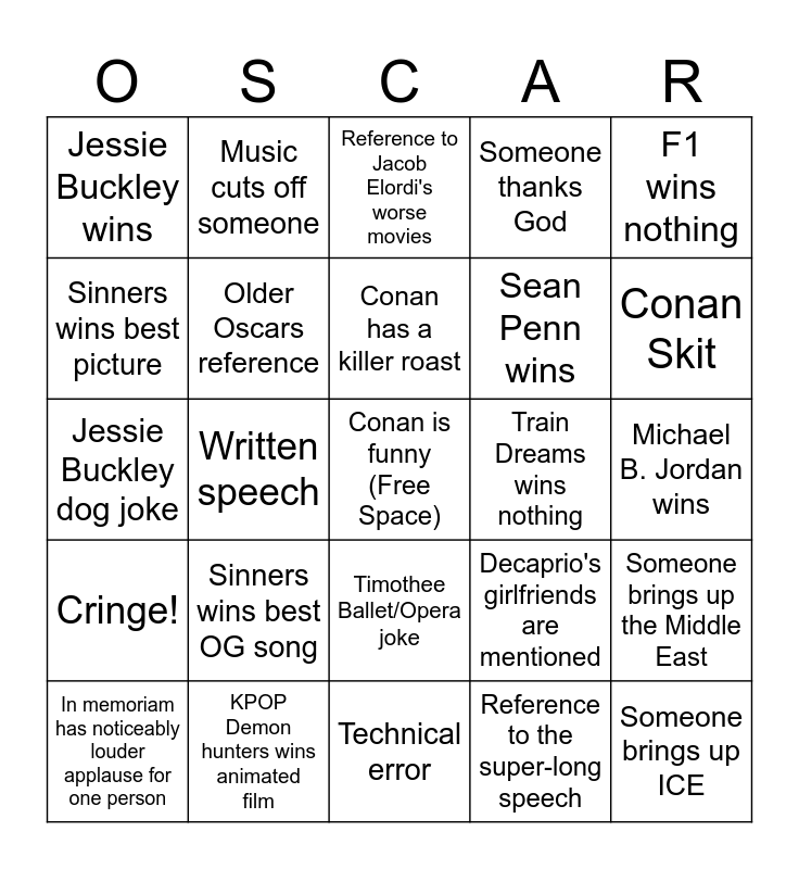 This bingo card has a free space and 24 words: Sinners wins best OG song, KPOP Demon hunters wins animated film, Conan has a killer roast, In memoriam has noticeably louder applause for one person, F1 wins nothing, Jessie Buckley wins, Sinners wins best picture, Music cuts off someone, Train Dreams wins nothing, Timothee Ballet/Opera joke, Sean Penn wins, Jessie Buckley dog joke, Decaprio's girlfriends are mentioned, Someone brings up the Middle East, Older Oscars reference, Reference to the super-long speech, Michael B. Jordan wins, Reference to Jacob Elordi's worse movies, Conan Skit, Written speech, Someone brings up ICE, Cringe!, Someone thanks God and Technical error.