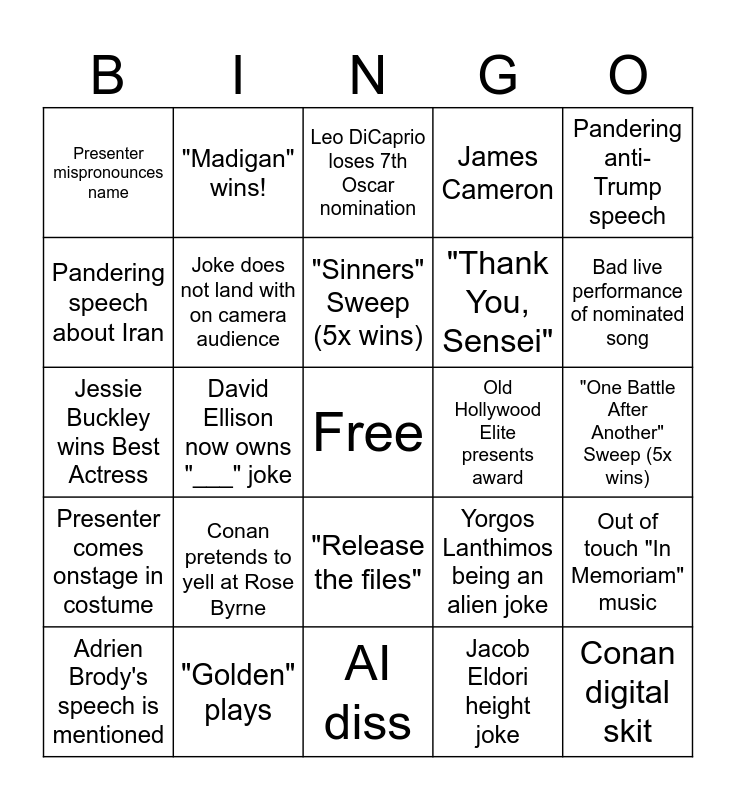 This bingo card has a free space and 24 words: Conan pretends to yell at Rose Byrne, "Golden" plays, "Sinners" Sweep (5x wins), Adrien Brody's speech is mentioned, Pandering anti-Trump speech, Presenter mispronounces name, Pandering speech about Iran, "Madigan" wins!, Old Hollywood Elite presents award, "Release the files", "Thank You, Sensei", Jessie Buckley wins Best Actress, Yorgos Lanthimos being an alien joke, Out of touch "In Memoriam" music, Joke does not land with on camera audience, Jacob Eldori height joke, "One Battle After Another" Sweep (5x wins), Leo DiCaprio loses 7th Oscar nomination, Bad live performance of nominated song, David Ellison now owns "___" joke, Conan digital skit, Presenter comes onstage in costume, James Cameron and AI diss.