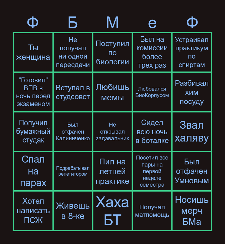 This bingo card has 25 words: Спал на парах, Живешь в 8-ке, Не открывал задавальник, Получал матпомощь, Устраивал практикум по спиртам, Ты женщина, Не получал ни одной пересдачи, Поступил по биологии, Сидел всю ночь в боталке, Был отфачен Умновым, "Готовил" ВПВ в ночь перед экзаменом, Вступал в студсовет, Хаха БТ, Посетил все пары на первой неделе семестра, Разбивал хим посуду, Хотел написать ПСЖ, Был отфачен Калиниченко, Любишь мемы, Любовался БиоКорпусом, Звал халяву, Получил бумажный студак, Подрабатывал репетитором, Пил на летней практике, Был на комиссии более трех раз and Носишь мерч БМа.