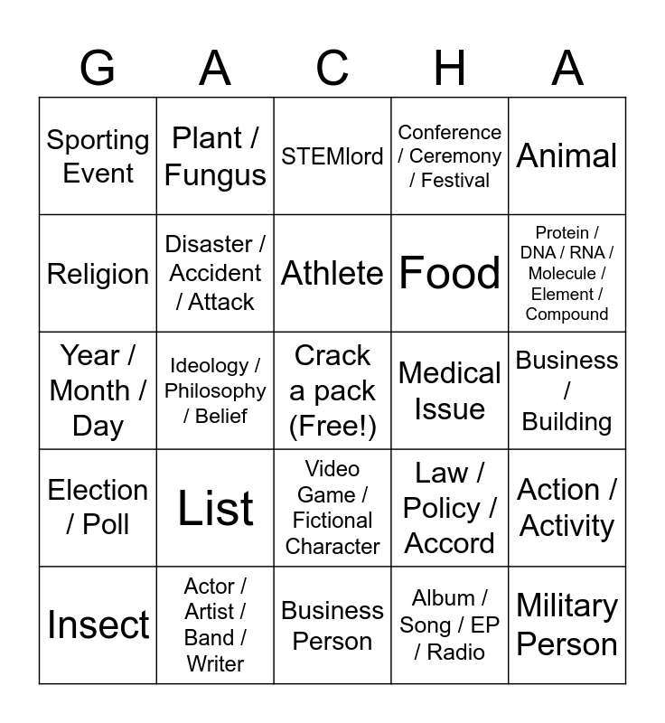 This bingo card has a free space and 34 words: Film / Short / Series / Photo / Painting, Album / Song / EP / Radio, Political Figure, Geographic Location, Election / Poll, Disaster / Accident / Attack, Animal, Insect, Plant / Fungus, Transportation / Infrastructure, Athlete, STEMlord, Tool / Tech, Military Conflict, Medical Issue, Protein / DNA / RNA / Molecule / Element / Compound, Actor / Artist / Band / Writer, Year / Month / Day, List, Law / Policy / Accord, Video Game / Fictional Character, Book / Short Story / Essay / Poem / Comic, Sporting Event, Business / Building, Business Person, Military Person, Conference / Ceremony / Festival, Meme, Food, Religion, Language / Surname, Ideology / Philosophy / Belief, Action / Activity and Team / Group / Organization.