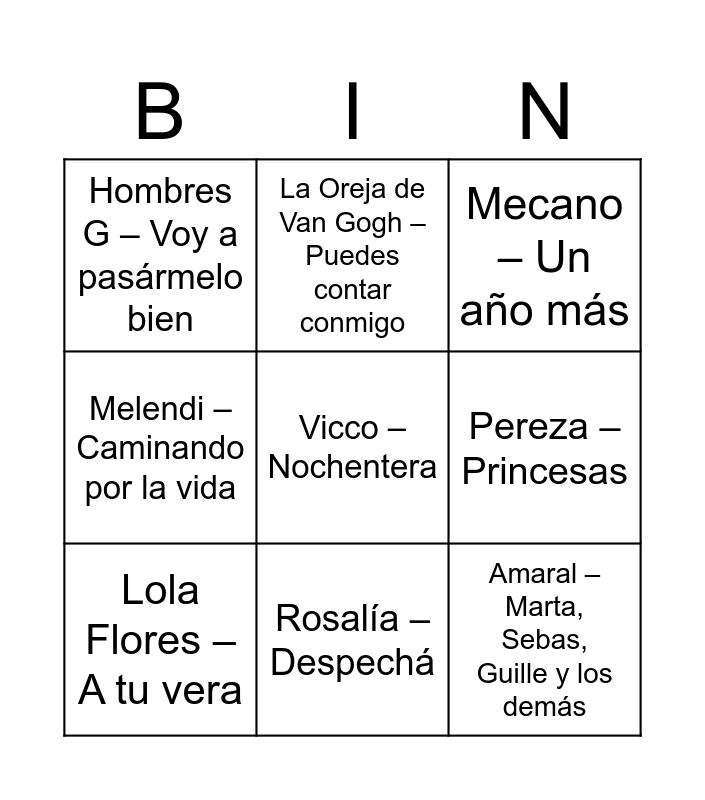 This bingo card has 30 words: Marisol – Tómbola, Nino Bravo – Libre, Raffaella Carrà – Hay que venir al sur, Alaska y Dinarama – Ni tú ni nadie, Hombres G – Voy a pasármelo bien, Mecano – Un año más, Lola Flores – A tu vera, Jeanette – Porque te vas, Camilo Sesto – Vivir así es morir de amor, Raphael – Mi gran noche, Los del Río – Macarena, King África – La Bomba, Azúcar Moreno – Solo se vive una vez, David Bisbal – Ave María, Sonia y Selena – Yo quiero bailar, Coyote Dax – No rompas más, Las Ketchup – Aserejé, Don Omar – Danza Kuduro, Ricky Martin – La Copa de la Vida, Vicco – Nochentera, El Canto del Loco – Zapatillas, Estopa – Tu calorro, La Oreja de Van Gogh – Puedes contar conmigo, Amaral – Marta, Sebas, Guille y los demás, Pereza – Princesas, Melendi – Caminando por la vida, Fito & Fitipaldis – Soldadito marinero, Nena Daconte – En qué estrella estará, Rosalía – Despechá and C. Tangana – Tú me dejaste de querer.