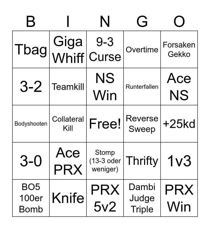 This bingo card has a free space and 24 words: Ace PRX, Knife, NS Win, BO5 100er Bomb, Forsaken Gekko, Tbag, 3-2, Giga Whiff, Reverse Sweep, Stomp (13-3 oder weniger), Runterfallen, Bodyshooten, Thrifty, 1v3, Teamkill, Dambi Judge Triple, +25kd, 9-3 Curse, Ace NS, Collateral Kill, PRX Win, 3-0, Overtime and PRX 5v2.