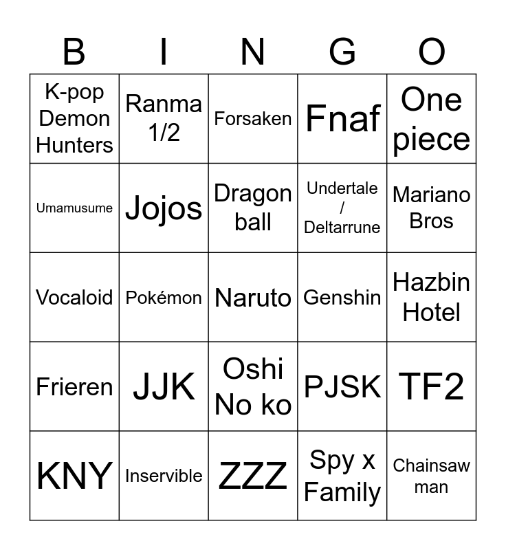 This bingo card has 25 words: JJK, ZZZ, Dragon ball, KNY, One piece, K-pop Demon Hunters, Umamusume, Ranma 1/2, Genshin, Oshi No ko, Undertale / Deltarrune, Vocaloid, PJSK, TF2, Jojos, Chainsaw man, Hazbin Hotel, Forsaken, Mariano Bros, Pokémon, Naruto, Inservible, Frieren, Fnaf and Spy x Family.