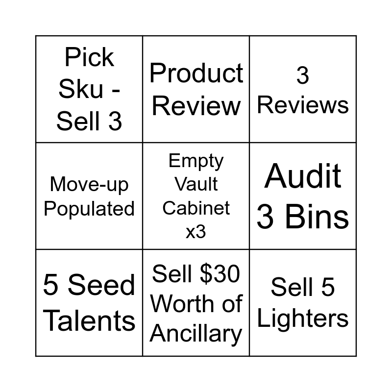 This bingo card has 9 words: 5 Seed Talents, 3 Reviews, Product Review, Move-up Populated, Pick Sku - Sell 3, Audit 3 Bins, Empty Vault Cabinet x3, Sell 5 Lighters and Sell $30 Worth of Ancillary.