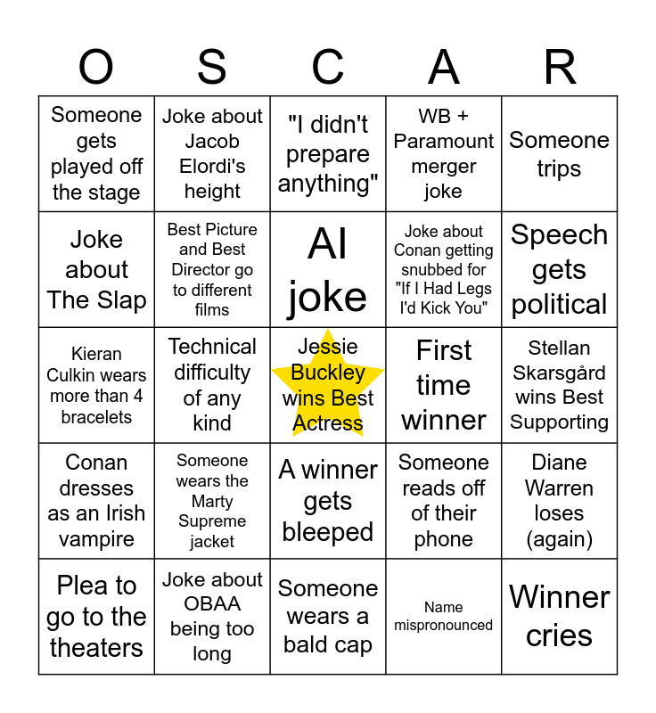 This bingo card has a free space and 36 words: Sean Penn doesn't attend, Joke about Timmy's ballet/opera comment, Someone gets spanked with a ping pong paddle, Best Picture and Best Director go to different films, Someone reads off of their phone, Conan dresses as an Irish vampire, AI joke, Someone thanks God, Someone trips, "Sinners" wins Best Picture, Technical difficulty of any kind, WB + Paramount merger joke, Adrien Brody is annoying, First time winner, Speech gets political, Someone gets played off the stage, Ozempic joke, Someone wears the Marty Supreme jacket, Winner cries, "I didn't prepare anything", Stellan Skarsgård wins Best Supporting, Diane Warren loses (again), Joke about OBAA being too long, Plea to go to the theaters, Someone wears a bald cap, Joke about Jacob Elordi's height, Kieran Culkin wears more than 4 bracelets, Joke about Rose Byrne's new bearded dragon, Joke about Conan getting snubbed for "If I Had Legs I'd Kick You", Joke about The Slap, Conan has a musical number, Sinners wins Best Original Score, Name mispronounced, A winner gets bleeped, BAFTAs mention and Someone does the "Weapons" run.