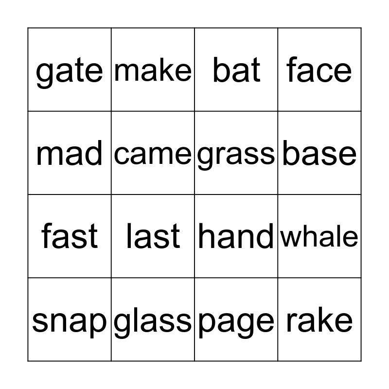 This bingo card has 16 words: glass, whale, bat, gate, fast, make, hand, page, mad, came, snap, face, last, base, grass and rake.