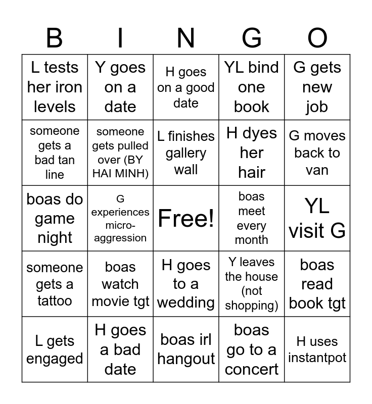 This bingo card has a free space and 24 words: boas watch movie tgt, H goes a bad date, L finishes gallery wall, L gets engaged, G gets new job, L tests her iron levels, someone gets a bad tan line, Y goes on a date, boas meet every month, H goes to a wedding, H dyes her hair, boas do game night, Y leaves the house (not shopping), boas read book tgt, someone gets pulled over (BY HAI MINH), boas go to a concert, YL visit G, H goes on a good date, G moves back to van, G experiences micro-aggression, H uses instantpot, someone gets a tattoo, YL bind one book and boas irl hangout.