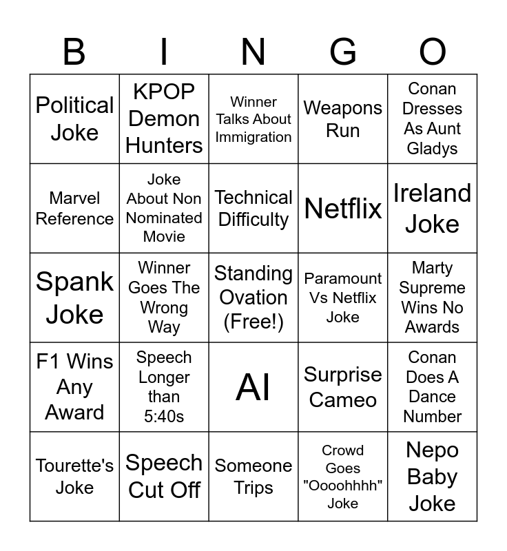 This bingo card has a free space and 24 words: Speech Longer than 5:40s, Speech Cut Off, Technical Difficulty, Tourette's Joke, Conan Dresses As Aunt Gladys, Political Joke, Marvel Reference, KPOP Demon Hunters, Paramount Vs Netflix Joke, AI, Netflix, Spank Joke, Surprise Cameo, Conan Does A Dance Number, Joke About Non Nominated Movie, Crowd Goes "Oooohhhh" Joke, Marty Supreme Wins No Awards, Winner Talks About Immigration, Ireland Joke, Winner Goes The Wrong Way, Nepo Baby Joke, F1 Wins Any Award, Weapons Run and Someone Trips.