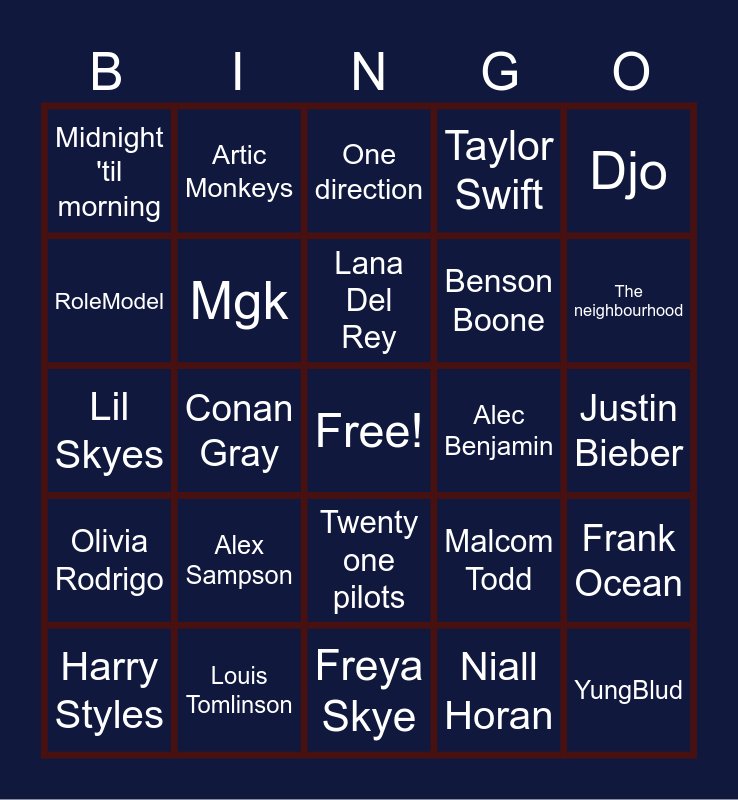 This bingo card has a free space and 29 words: Harry Styles, Tate Mcrae, Conan Gray, Alex Warren, Midnight 'til morning, One direction, Mgk, Alex Sampson, Alec Benjamin, Louis Tomlinson, Justin Bieber, YungBlud, Freya Skye, Niall Horan, The neighbourhood, Liam Payne, Twenty one pilots, Olivia Rodrigo, Djo, Lil Skyes, Malcom Todd, Zayn Malik, Benson Boone, RoleModel, Taylor Swift, Artic Monkeys, Frank Ocean, Lana Del Rey and ColdPlay.