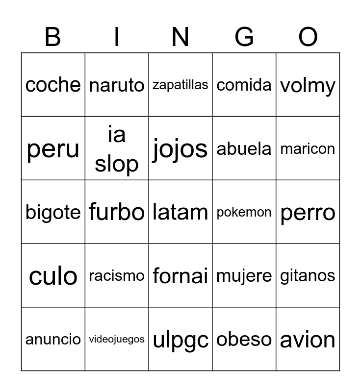 This bingo card has a free space and 24 words: racismo, videojuegos, jojos, anuncio, volmy, coche, peru, naruto, pokemon, fornai, abuela, bigote, mujere, gitanos, ia slop, obeso, perro, zapatillas, maricon, furbo, avion, culo, comida and ulpgc.