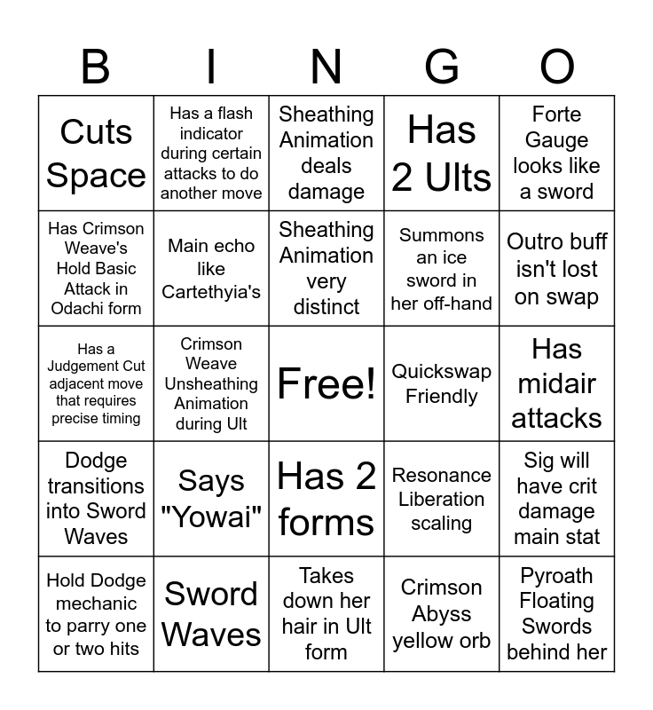 This bingo card has a free space and 24 words: Says "Yowai", Sword Waves, Sheathing Animation very distinct, Hold Dodge mechanic to parry one or two hits, Forte Gauge looks like a sword, Cuts Space, Has Crimson Weave's Hold Basic Attack in Odachi form, Has a flash indicator during certain attacks to do another move, Quickswap Friendly, Has 2 forms, Summons an ice sword in her off-hand, Has a Judgement Cut adjacent move that requires precise timing, Resonance Liberation scaling, Sig will have crit damage main stat, Main echo like Cartethyia's, Crimson Abyss yellow orb, Has midair attacks, Sheathing Animation deals damage, Outro buff isn't lost on swap, Crimson Weave Unsheathing Animation during Ult, Pyroath Floating Swords behind her, Dodge transitions into Sword Waves, Has 2 Ults and Takes down her hair in Ult form.