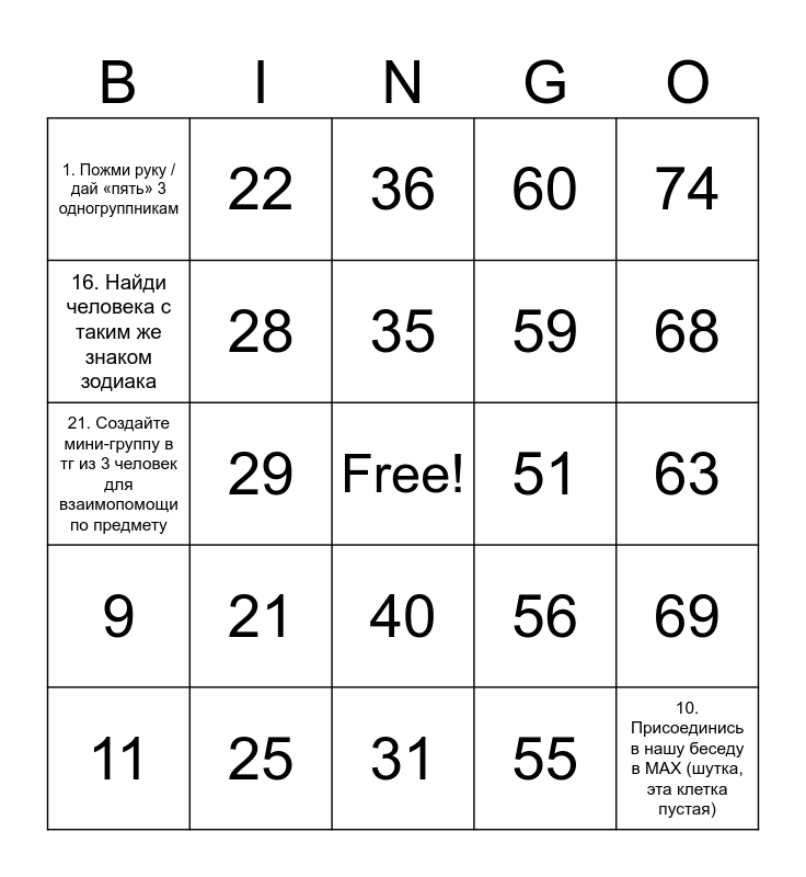 This bingo card has a free space and 101 words: 1, 16, 31, 46, 61, 2, 17, 32, 47, 62, 3, 18, 48, 63, 4, 19, 33, 49, 64, 5, 20, 34, 50, 65, 6, 21, 35, 51, 66, 7, 22, 36, 52, 67, 8, 23, 37, 53, 68, 9, 24, 38, 54, 69, 10, 25, 39, 55, 70, 11, 26, 40, 56, 71, 12, 27, 41, 57, 72, 13, 28, 42, 58, 73, 14, 29, 43, 59, 74, 15, 30, 44, 60, 75, 45, 1. Пожми руку / дай «пять» 3 одногруппникам, 2. Найди того, у кого такой же цвет одежды / аксессуара, 3. Найди человека с таким же месяцем рождения, 4. Узнай, какое хобби у твоего соседа по парте, 5. Спроси: «Какой предмет в этом семестре тебе интересен больше всего?», 6. Сделай искренний комплимент 3 одногруппникам, 7.Расскажи одногруппнику один интересный факт о себе за 15 секунд, 8. Сделай комплимент преподавателю, 9. Напиши в общий чат группы: «Привет, я [имя] и я рад быть с вами!», 10. Присоединись в нашу беседу в MAX (шутка, эта клетка пустая), 11. Обменяйся с одногруппником одним полезным ресурсом, 12. Найди определение Адаптация в словаре / интернете, 13. Пожми руку 5 коллегам, 14. Придумайте с соседом смешное, но доброе прозвище для вашей группы, 15. Сделай «селфи» с 5 коллегами и отправь в чат, 16. Найди человека с таким же знаком зодиака, 17. Хором с 3 людьми произнесите: «Убешки!», 18. Сделайте мини-аплодисменты соседу, 19. Вместе с соседом придумайте одну цель на эту учебную неделю, 20. Поддержите аплодисментами того, кто ответил у доски, 21. Создайте мини-группу в тг из 3 человек для взаимопомощи по предмету, 22. Обсудите с соседом один плюс сегодняшнего занятия, 23. Пожелай удачи 3 одногруппникам перед ближайшей контрольной, 24. Поздоровался с 5 коллегами, 25. Сделай селфи с коллегой и с кинь в беседу and 26. Написал в общий чат «Привет!».