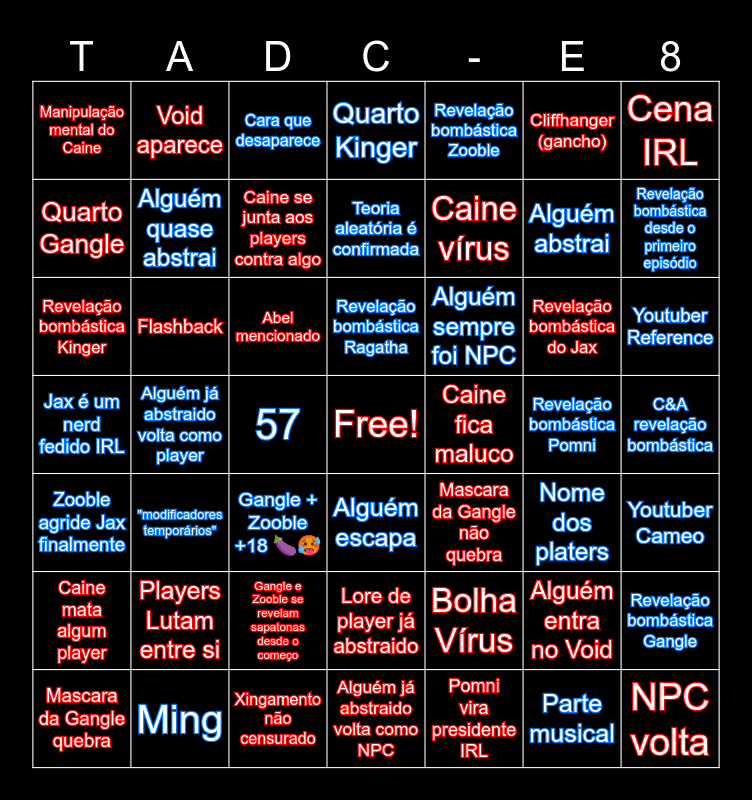 This bingo card has a free space and 48 words: Bolha Vírus, Alguém abstrai, Alguém já abstraido volta como NPC, Alguém já abstraido volta como player, Abel mencionado, C&A revelação bombástica, Void aparece, Ming, Cliffhanger (gancho), Alguém escapa, Cena IRL, Quarto Kinger, Revelação bombástica do Jax, Alguém sempre foi NPC, Caine mata algum player, Revelação bombástica Pomni, Quarto Gangle, Revelação bombástica desde o primeiro episódio, Alguém entra no Void, Revelação bombástica Zooble, Caine vírus, 57, Manipulação mental do Caine, Alguém quase abstrai, Revelação bombástica Gangle, Caine se junta aos players contra algo, Youtuber Reference, Mascara da Gangle quebra, Revelação bombástica Ragatha, Flashback, Parte musical, Caine fica maluco, Youtuber Cameo, Players Lutam entre si, Jax é um nerd fedido IRL, Mascara da Gangle não quebra, Nome dos platers, Revelação bombástica Kinger, Gangle + Zooble +18 🍆🥵, Gangle e Zooble se revelam sapatonas desde o começo, Zooble agride Jax finalmente, NPC volta, Cara que desaparece, Xingamento não censurado, Teoria aleatória é confirmada, Lore de player já abstraido, "modificadores temporários" and Pomni vira presidente IRL.