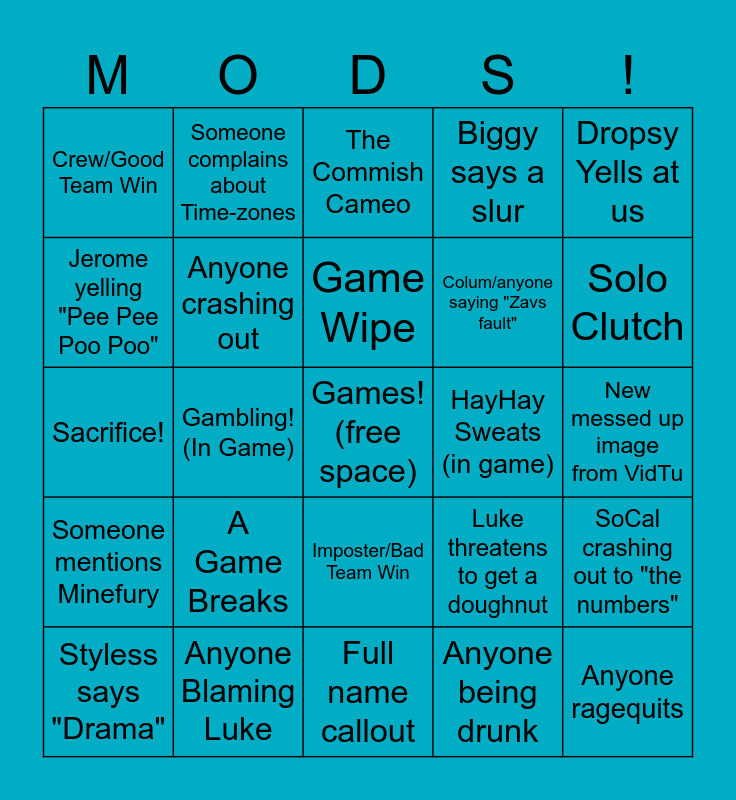 This bingo card has a free space and 28 words: SoCal crashing out to "the numbers", A regular inappropriate frank comment, Colum/anyone saying "Zavs fault", Anyone being drunk, Jerome yelling "Pee Pee Poo Poo", The Commish Cameo, Someone complains about Time-zones, Someone mentions Minefury, HayHay Sweats (in game), Styless says "Drama", Sacrifice!, Biggy says a slur, Anyone Blaming Luke, Full name callout, Solo Clutch, Someone's game Crashes, A Game Breaks, Anyone crashing out, Game Wipe, Imposter/Bad Team Win, Crew/Good Team Win, Jerome being a menace, Anyone ragequits, Gambling! (In Game), New messed up image from VidTu, Luke threatens to get a doughnut, Dropsy Yells at us and Someone Flirts.