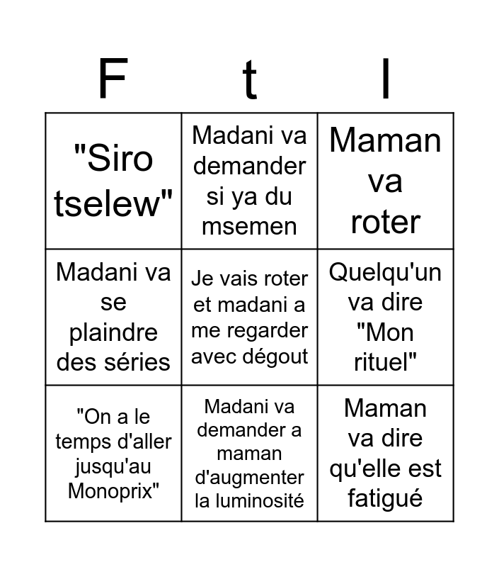 This bingo card has a free space and 8 words: Quelqu'un va dire "Mon rituel", Maman va roter, Madani va demander si ya du msemen, "On a le temps d'aller jusqu'au Monoprix", "Siro tselew", Maman va dire qu'elle est fatigué, Madani va se plaindre des séries and Madani va demander a maman d'augmenter la luminosité.