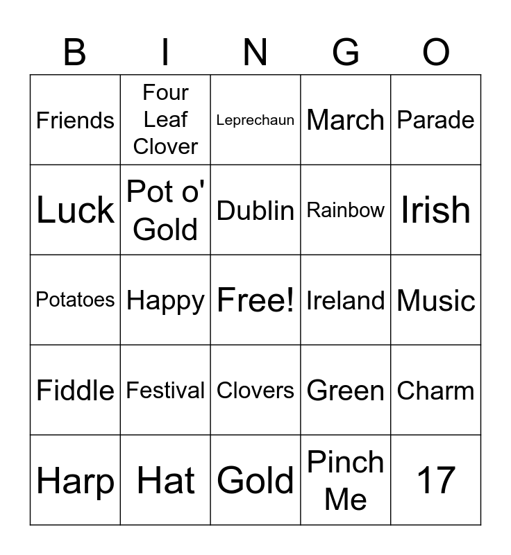 This bingo card has a free space and 27 words: Green, Shamrock, Rainbow, Gold, Luck, Leprechaun, Four Leaf Clover, Fiddle, Ireland, Charm, Potatoes, March, Harp, Hat, Irish, Patrick, Pot o' Gold, Dublin, Festival, Friends, Music, Pinch Me, Happy, 17, Clovers, Parade and Cabbage.